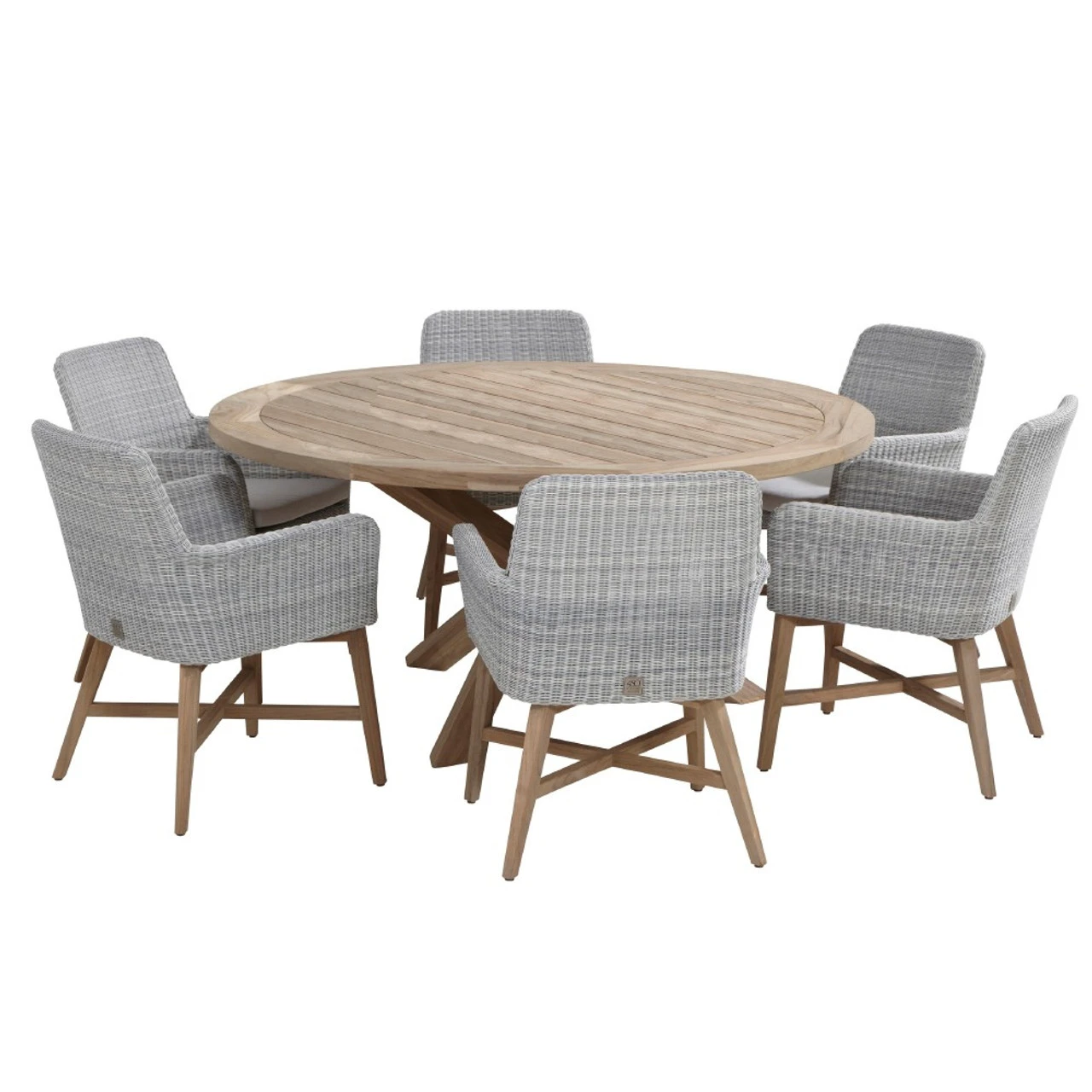 6 Lisboa dining chairs Polyloom Ice with Teak base, combined with our Louvre Teak dining table. We love Teak wood, the natural look and warm feeling is perfect for combining in a modern way. The Lisboa range boasts a modern ergonomic shaped Tube in Ice colour. The contrast is amazing with the light grey Teak. Lisboa has 4 colour or material options. Enjoy our high-quality Hularo wicker as we give a 10-year Guarantee.