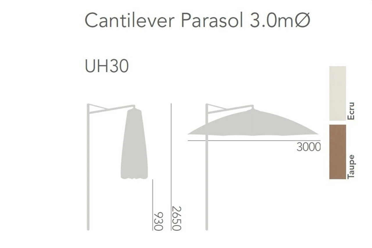 The Alexander Rose UH30 is a 18 spoke curved 3.0m cantilever parasol. As with the UHP it is easy to raise and lower the canopy with a crank handle mechanism. The canopy can be adjusted into 7 positions to give maximum shade from the sun. The parasol also has a foot operated pedal for 360º rotation. For use with the