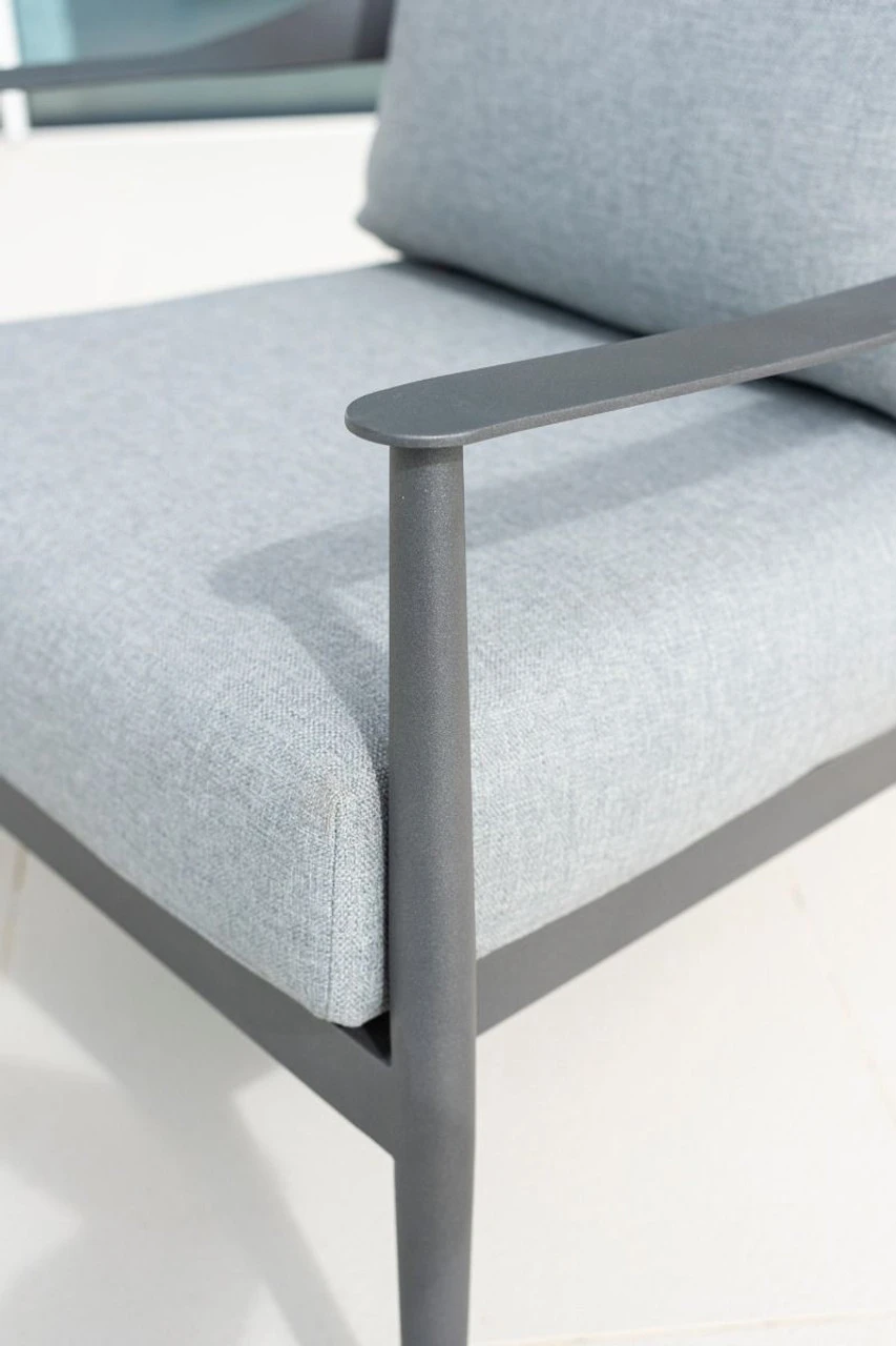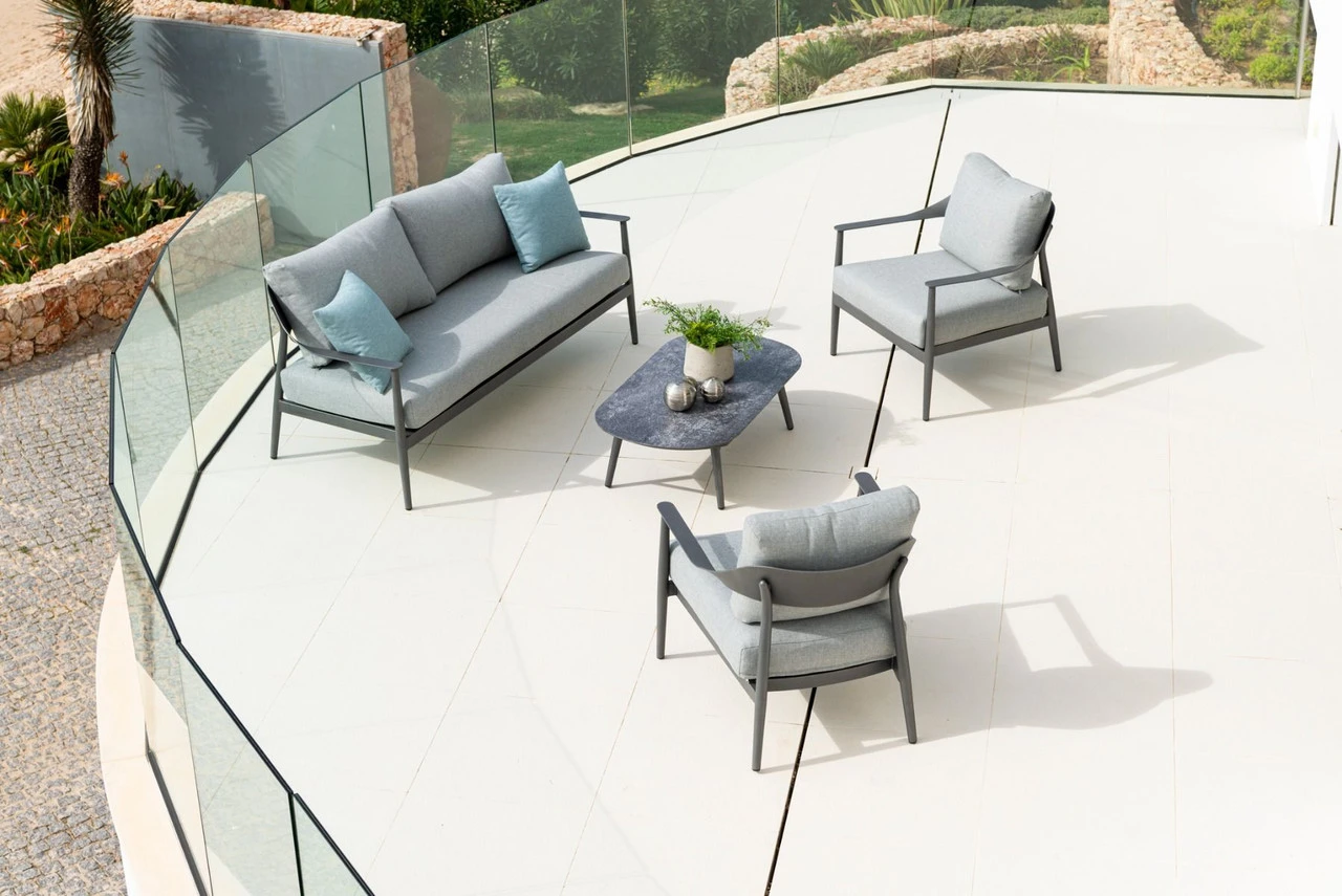 In line with the ever growing trend for aluminium furniture, 2021 sees the launch of the new Rimini collection, with its very distinct design features. The craftsmanship of the metal workers can really be appreciated in the quality of the welding and polishing of the frames, before being powder coated in a finely textured matt grey finish. The luxurious deep cushions come in a light grey colour to compliment the frames. All table tops come in a striking dappled grey ceramic effect glass. The extensive Rimini range will undoubtedly transform your outdoor space.