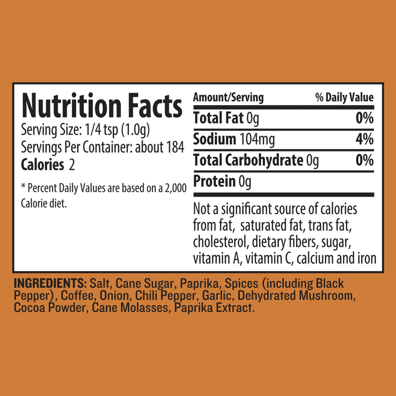 Ingredients: Cane Sugar, Salt, Onion, Chilli peppers, Paprika, Garlic, Chilli Pepper, Ginger, Dehydrated Mushroom, Cocoa Powder, Cane Molasses, Coffee
