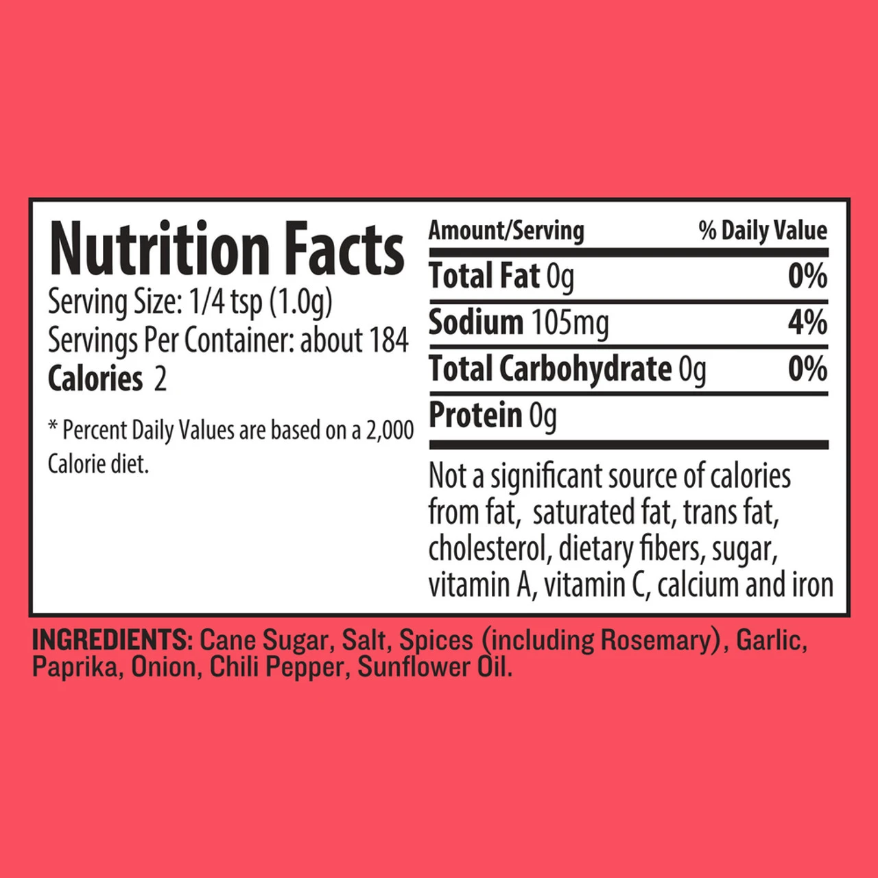 Ingredients: Cane Sugar, Salt, Onion, Chilli pepper, Paprika, Garlic, Sunflower Oil.