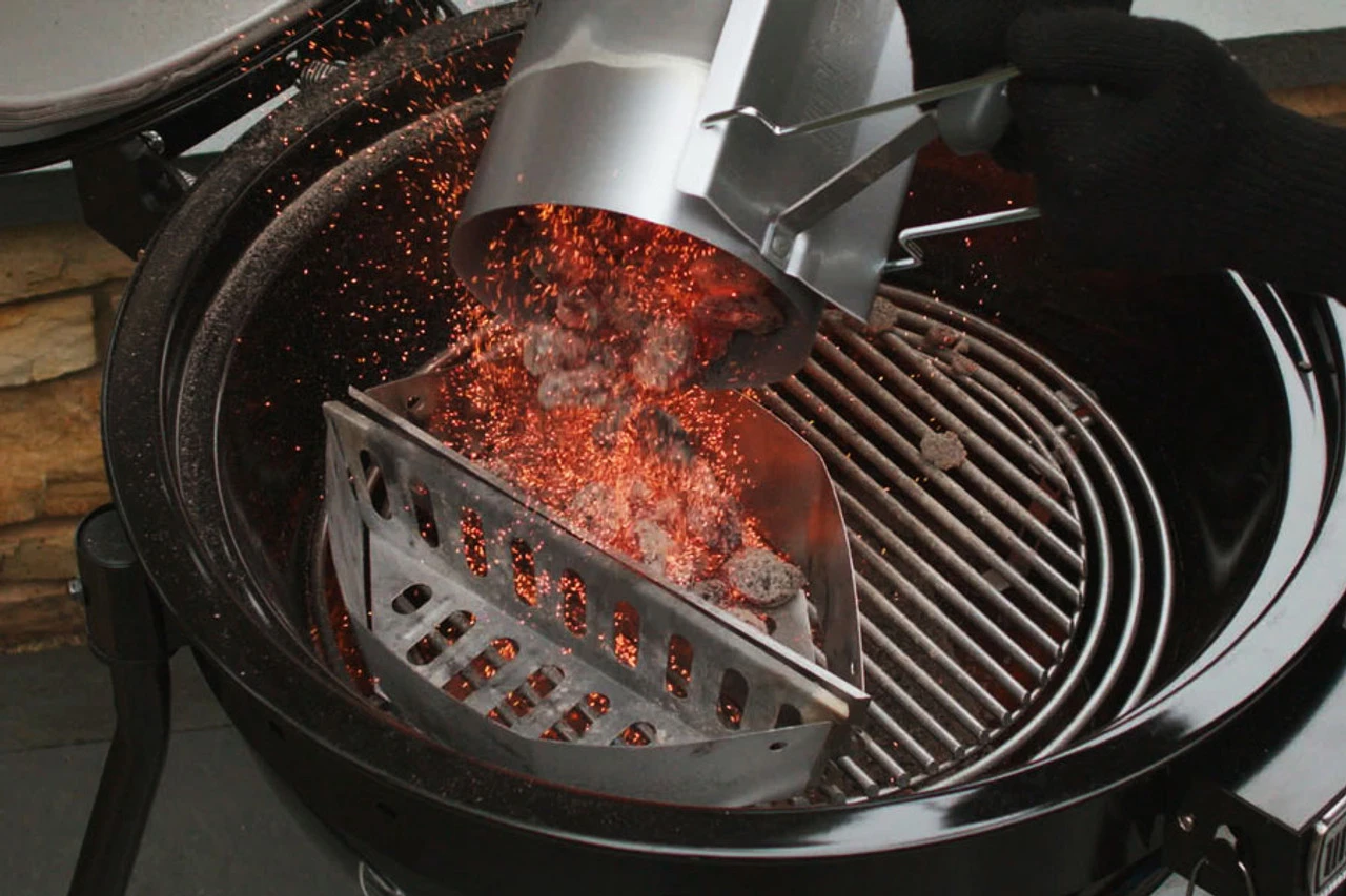 The Weber® Rapidfire™ Chimney Starter has a cone shaped charcoal grate that exposes more briquet edges to the flame, which in turn speed up ignition. Simply place the charcoal starter with coals over Weber® firelighters or crumpled newspaper and light. In under 20 minutes your coals will be ready to cook over (without the need to use messy lighter fluid!) – then carefully pour the hot coals along the bottom of the barbecue or into Weber® Briquette Holders for easy fuel management.
